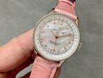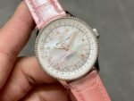 ❶ The watch features a 35mm case, synchronised with the original thickness of 9.9mm, with a beaded bezel rotating in both directions and a range of elegantly refined dial styles, such as silver, blue, copper dials or diamond-set white mother-of-pearl dials, ❷ 316L stainless steel case, ❸ Sapphire crystal. ❹ The watch is equipped with the original Swiss SW200-01 automatic mechanical movement (i.e. Breitling’s original cal.17 movement officially certified by Breitling) and 2824 two kinds of movement choices,❺ the strap is made of cowhide and alligator leather strap with original fine pin buckle, carefully designed to fit the wrist of major women, high-end and durable! Although the good work is late but sincere!