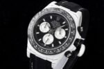 The Dew Collection Premium Super Carbon Fiber Customized Edition Cosmic Chronograph Daytona is a high-end watch that is made with premium materials and features a unique design. It is powered by a Swiss automatic movement and has a 44mm case made of carbon fiber. The dial is black with white accents and features a chronograph function. The watch also has a date window and a water resistance of 50 meters.
