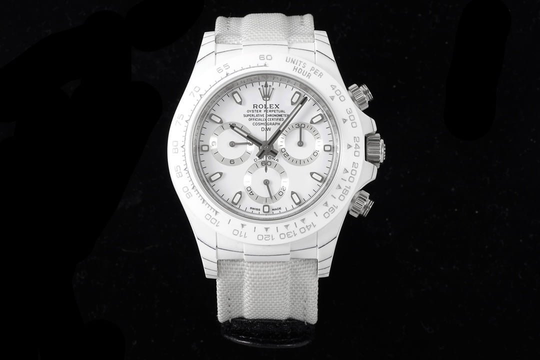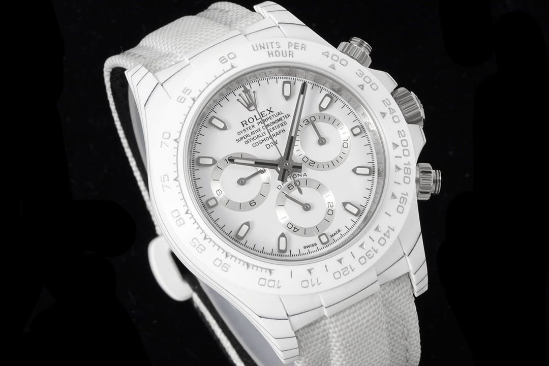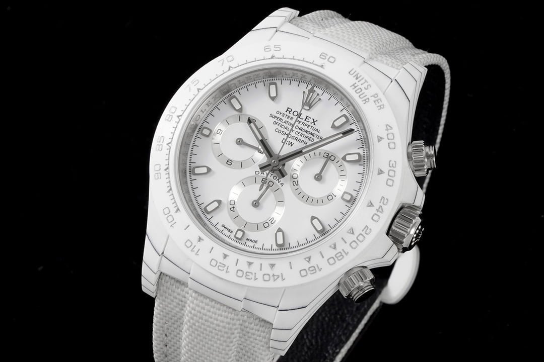 The Dew Collection Premium Super Carbon Fiber Customized Edition Cosmic Chronograph Daytona is a high-end watch that is made with premium materials and features a unique design. It is powered by a Swiss automatic movement and has a 44mm case made of carbon fiber. The dial is black with white accents and features a chronograph function. The watch also has a date window and a water resistance of 50 meters.