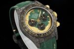 The Dew Collection Premium Super Carbon Fiber Customized Edition Cosmic Chronograph Daytona is a high-end watch that is made with premium materials and features a unique design. It is powered by a Swiss automatic movement and has a 44mm case made of carbon fiber. The dial is black with white accents and features a chronograph function. The watch also has a date window and a water resistance of 50 meters.