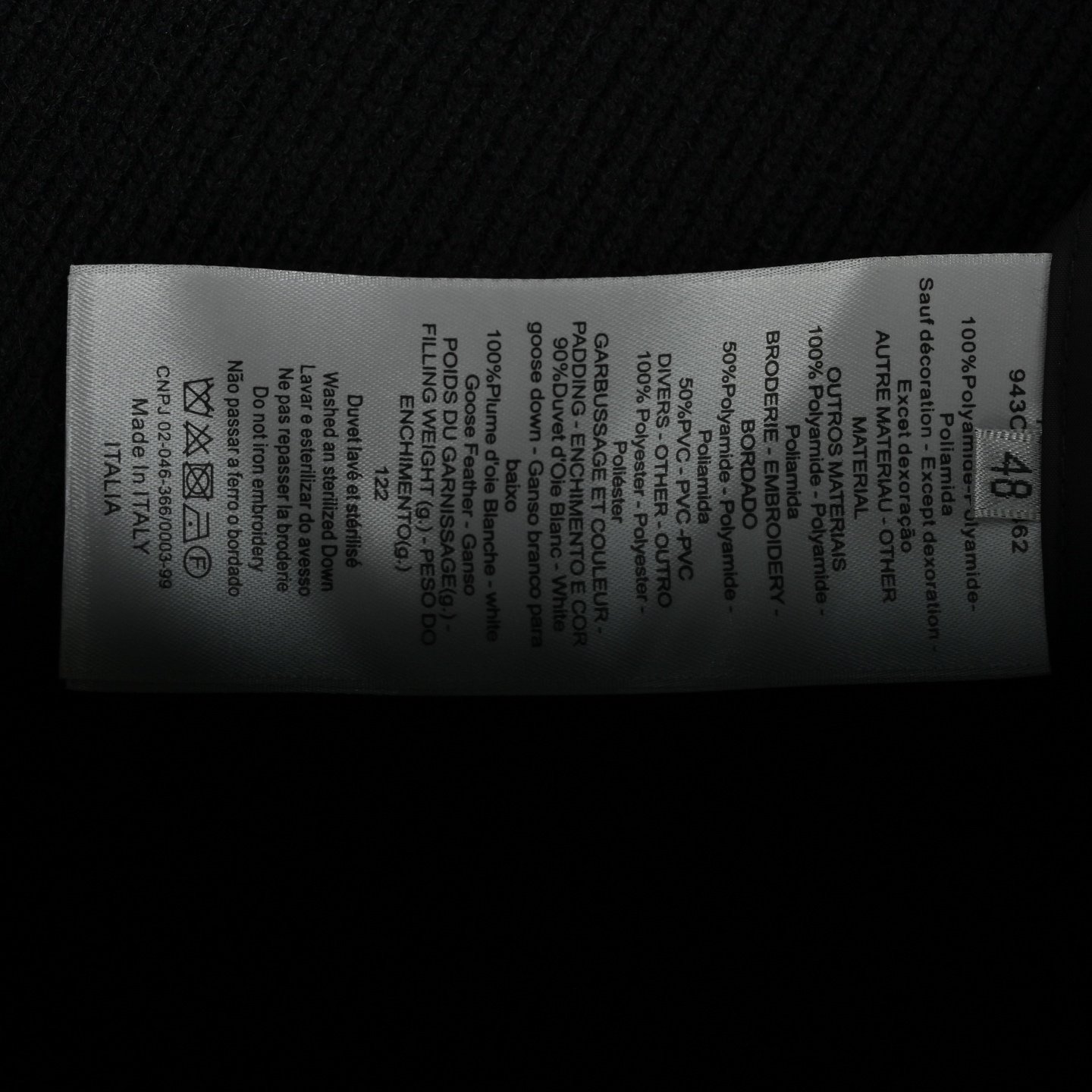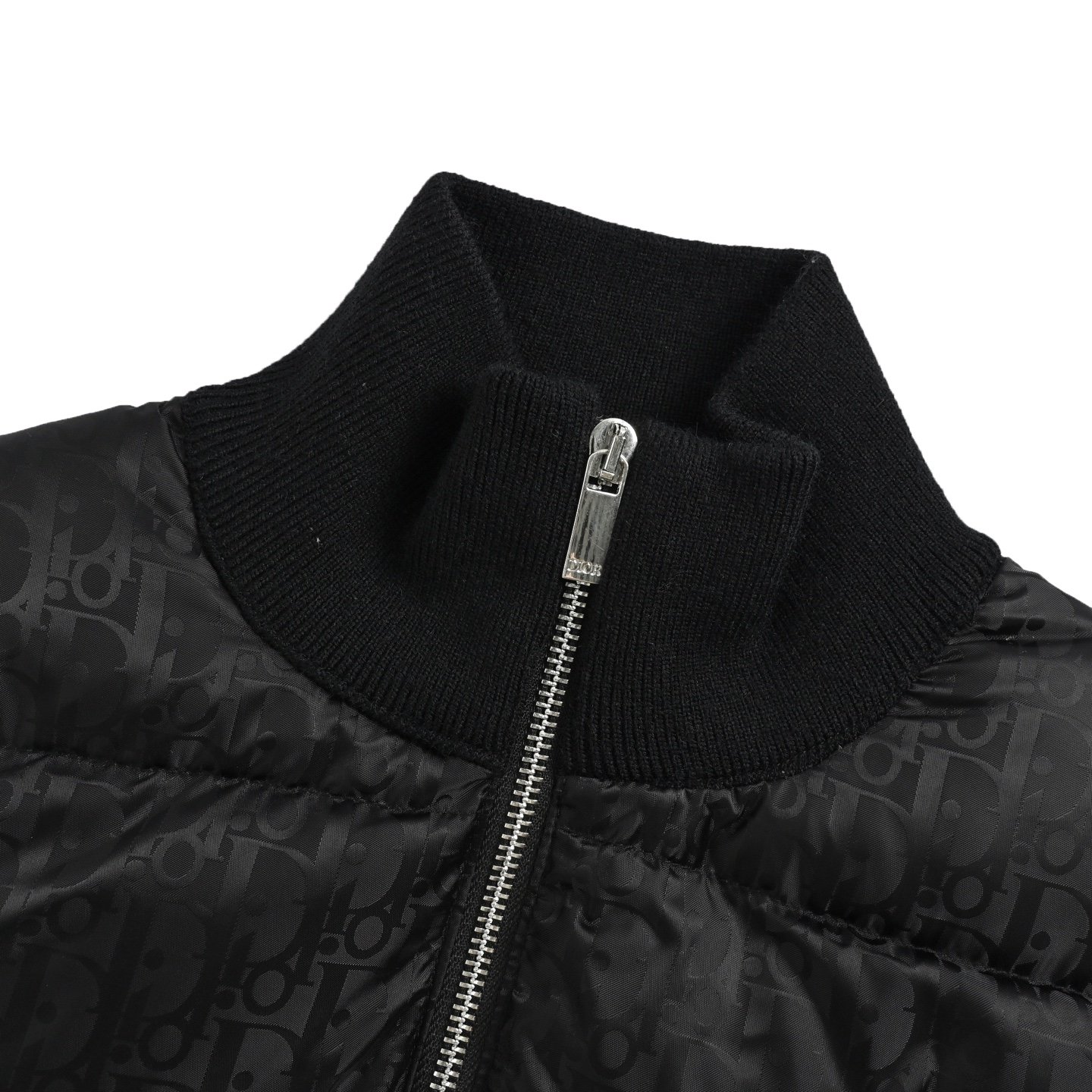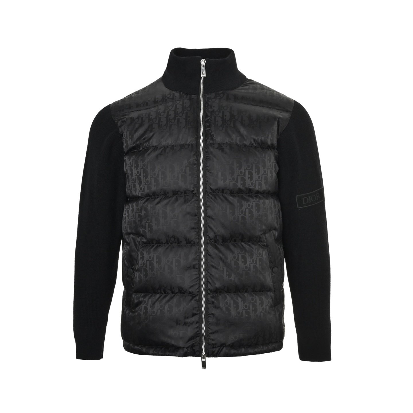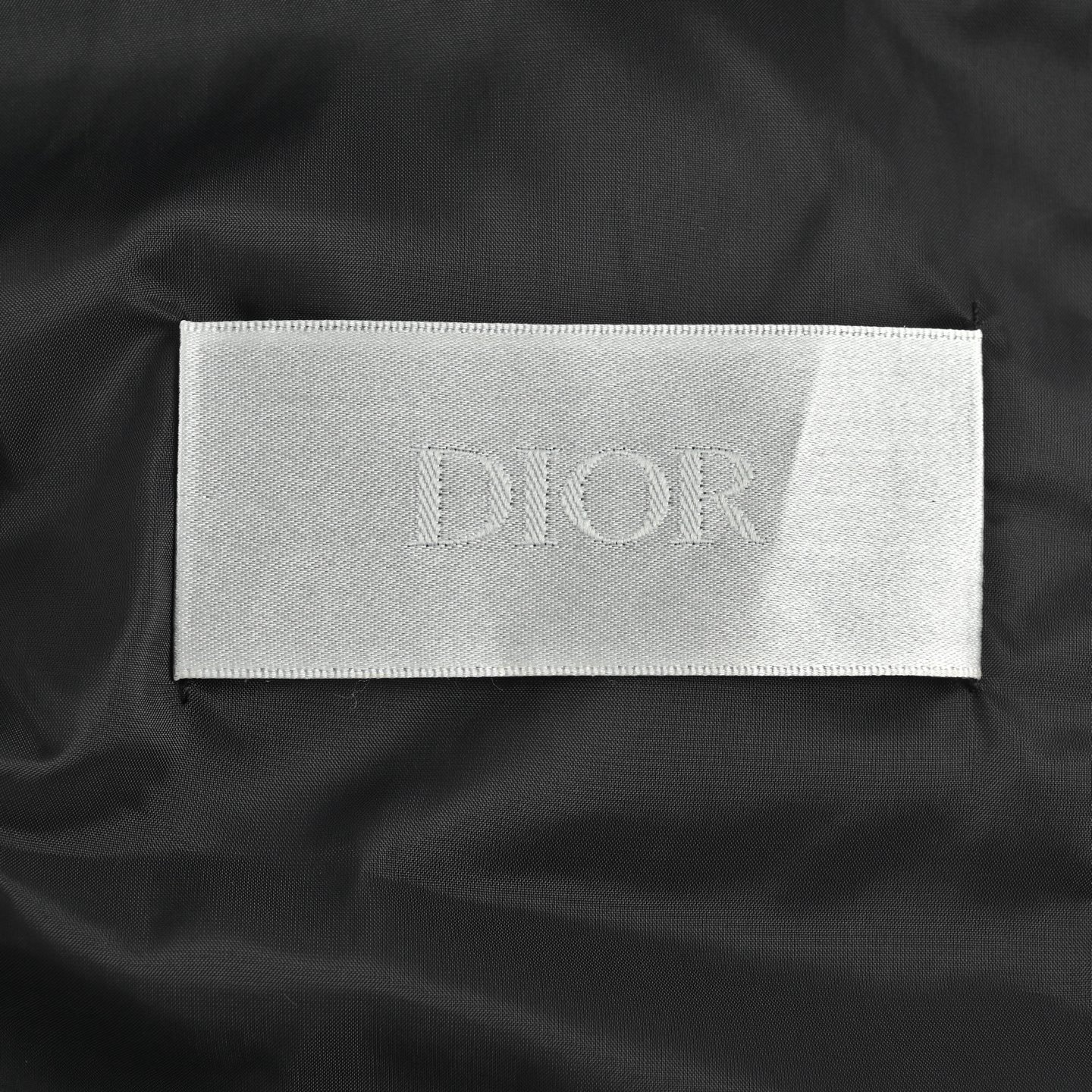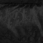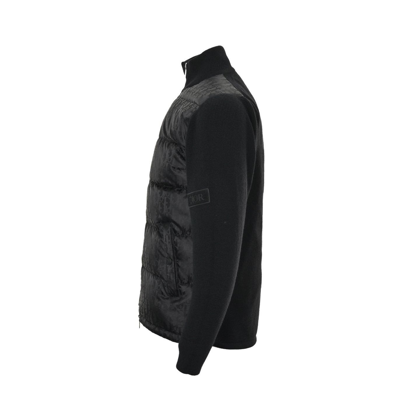 Logo: The left sleeve has a black Dior embroidered patch, and the zipper pull has a Dior stamped logo.