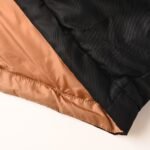 The lining uses 100% polyamide woven caramel brown nylon fabric, creating a strong color contrast when folded, like injecting molten gold from the sunset into the deep night sky. Polyamide fibers are known for their extremely high strength and excellent skin-friendly feel, with a silky smooth touch, avoiding the friction and discomfort that may occur when wearing heavy underwear. Working in conjunction with the outer nylon layer, it creates a breathable, heat-locking, and extremely comfortable microclimate, ensuring warmth and comfort without feeling stuffy or restrictive. Made with 90% white duck down with a fill power of 220g, it guarantees superior warmth. The down undergoes rigorous selection and processing to prevent down leakage. The 6cm high stand-up collar fits the neckline without being constricting, providing warmth like a “second skin” in the cold wind. The beveled seam at the collar and zipper avoids the stiffness of a traditional stand-up collar, adding a touch of dynamism when turning your head. The hem features built-in double-sided metal adjustment buckles; simply pull down to tighten the waistline, or pull up to restore a relaxed silhouette—sleek and tailored for commuting, and free and unrestrained for outdoor activities. The metal surface of the adjustment buckles is treated with PVD coating, making it wear-resistant, corrosion-resistant, and durable.