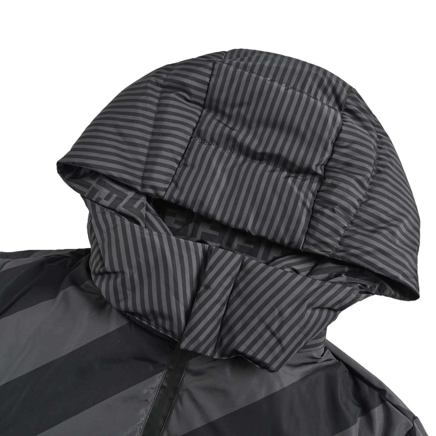 Custom high-density calendered nylon fabric, filled with 90% white duck down meeting new national standards.||||Full, lightweight, and warm, with a cloud-like softness against the skin. Reversible design: one side features a full-print FF classic pattern for a luxurious feel, while the other side boasts clean, individualistic twill lines. The varying shades of brown suit diverse styles. Computer-controlled precision down filling, digital direct-to-garment printing, and laser precision tailoring, combined with neat template stitching, result in exquisite craftsmanship and a premium feel. Fully custom 1:1 Fendi accessories, relaxed fit with a detachable and adjustable hood.