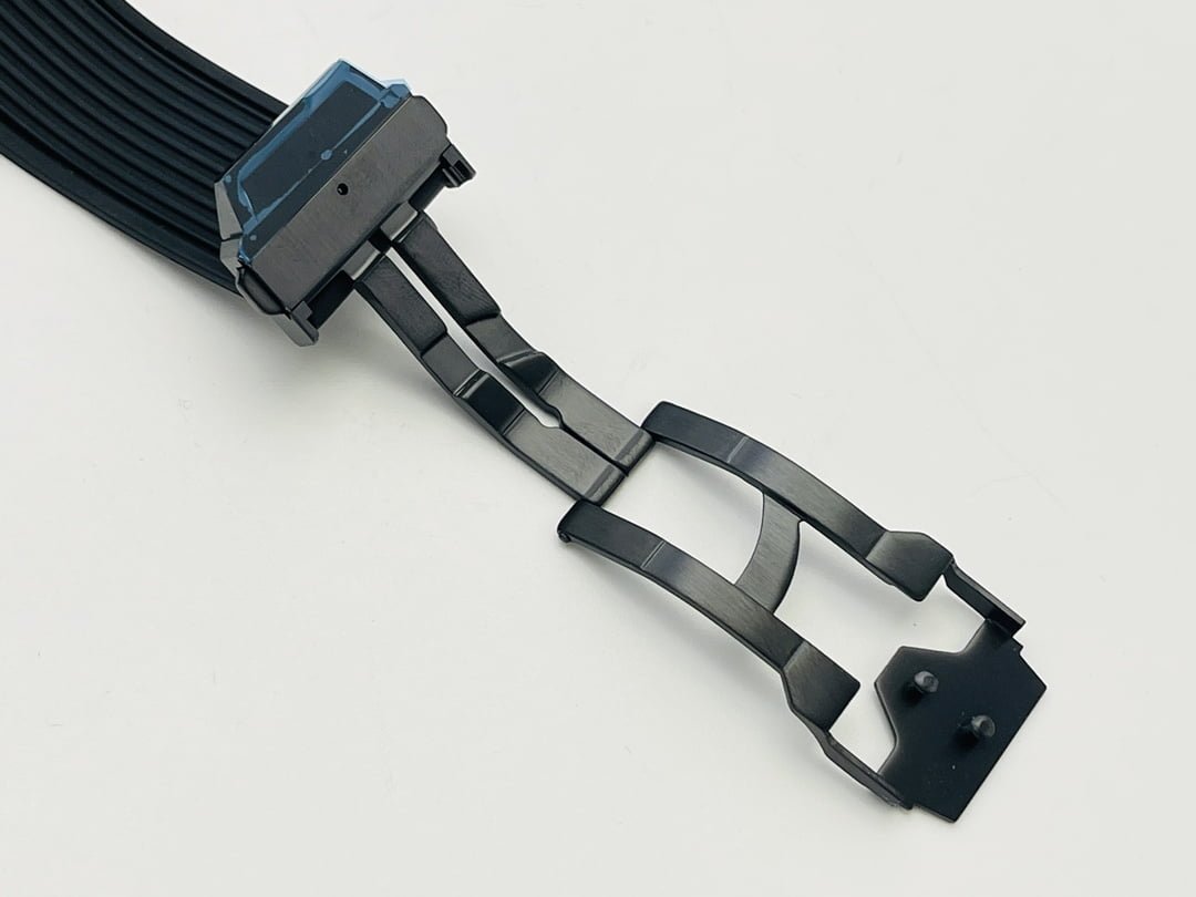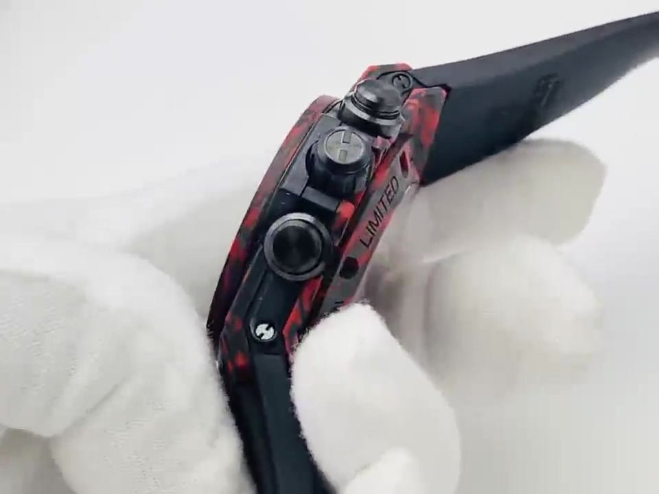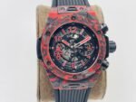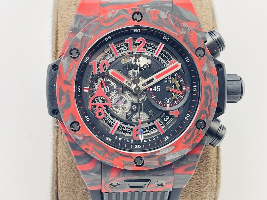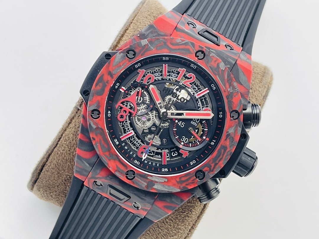 The new model follows the big bang series and is made of special carbon fiber materials. Yubo watch is equipped with 7750 modified "hub1242" automatic movement, which can be clearly seen through the watch case, and the beauty of extraordinary mechanical structure can be seen at a glance.Big bang series carbon fiber wristwatch adopts bold red, blue and black, showing an amazing strong visual impact effect. The internal precision mechanical structure is clearly presented through the watch case. The design of pointer and hour scale makes the whole surface send out a strong sense of rhythm and architecture, showing the extraordinary charm of time. The watch is equipped with a 30 minute timing dial at 3 o'clock and a second hand dial at 9 o'clock, which echoes the logo of Hublot Yubo watch at 12 o'clock.Watch with black structured rubber strap. In addition, the watch is equipped with a "one button" quick strap change system. The wearer can easily and quickly replace the strap with one click!!!