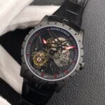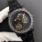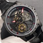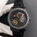 The BBR Roger Dubuis King Series Titanium Tourbillon Model: RDDBEX0479 is a high-end Superclone watch that is made to resemble the original Roger Dubuis King Series Tourbillon watch. It has a titanium case that is 45mm in diameter and 13.5mm in thickness. The watch is powered by a seagull custom RD505SQ winding movement, which is accurately adjusted in six directions and has a power reserve of up to 50 hours. The dial is hollowed out and features a luminous scale, black DLC coating, and a second dial in layered titanium. The hands are covered with a luminous coating for easy and clear reading. The watch is also equipped with a sapphire crystal glass with anti-glare coating and a natural rubber strap imported from Germany.
